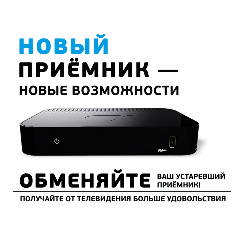 В период с 09.01.19 г. по 31.12.20 г. владельцам устаревшего оборудования предоставлена возможность обменять его на современный Ultra HD-приёмник доплатив всего 5800 рублей!